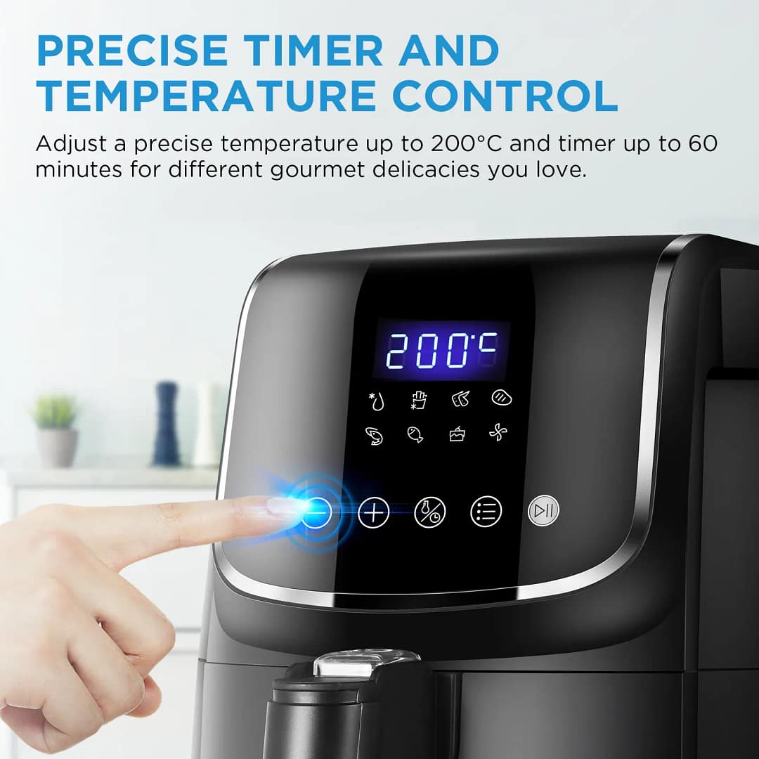 - 8 modes de cuisson préprogrammés : écran LED avec 8 programmes intégrés (friture à air chaud, grillage, rôtissage, grillades, cuisson au four, déshydratation, réchauffage et préparation de produits surgelés). Temps précis (60 minutes) et contrôle de la température (35-200°C) avec arrêt automatique et protection contre la surchauffe.