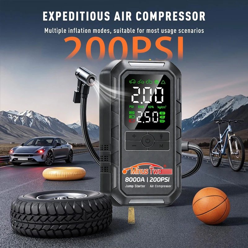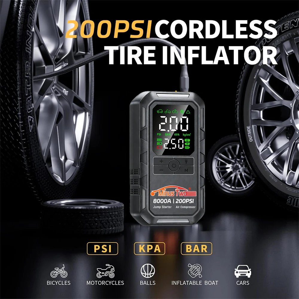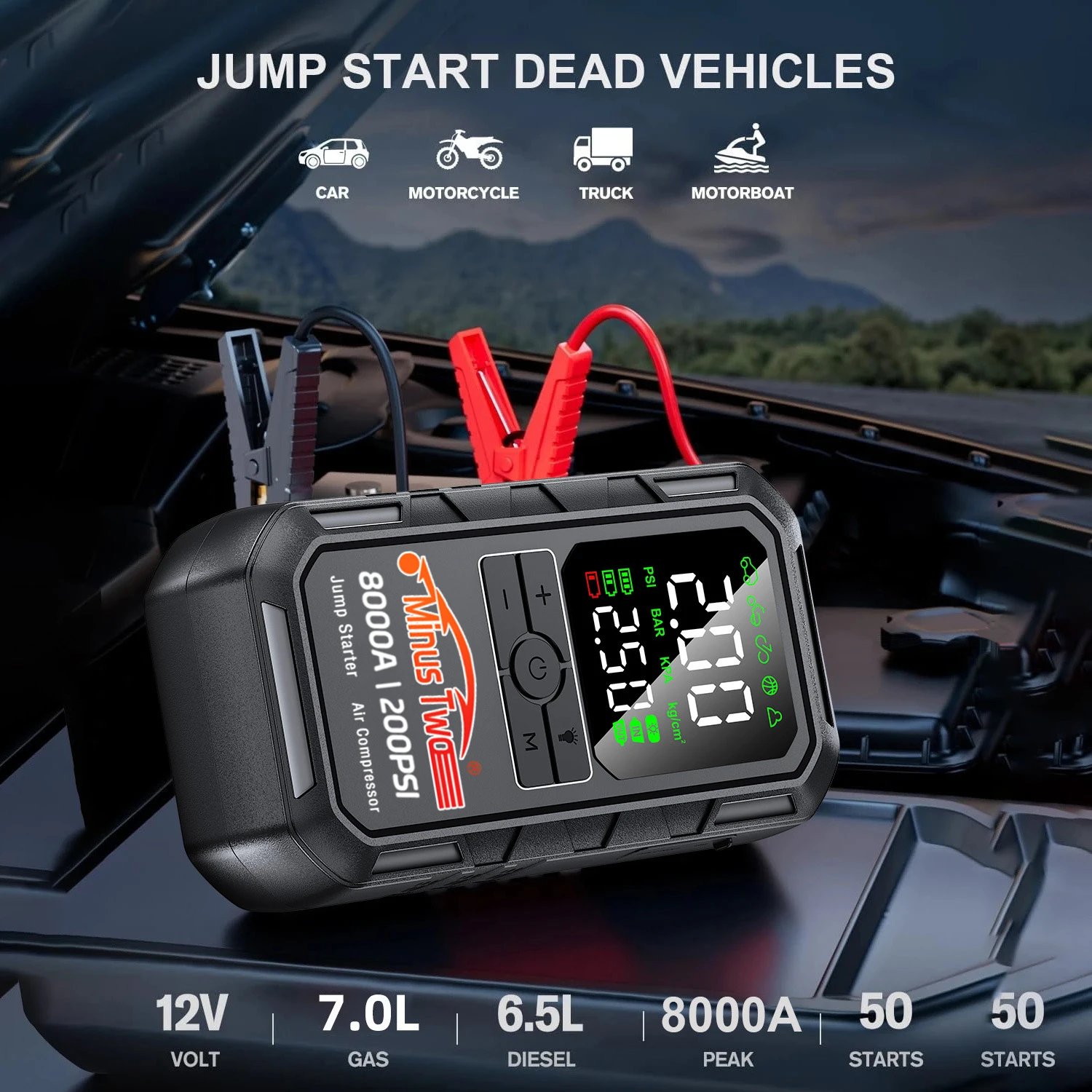 Démarreur de voiture 4‑en‑1 8000A avec compresseur 200 PSI – Booster batterie 30 000 mAh, gonfleur de pneus rapide & powerbank portable
