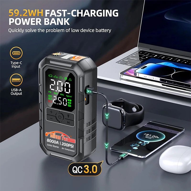 Démarreur 4‑en‑1 8000A avec compresseur 200 PSI, booster batterie 30 000 mAh, gonfleur de pneus et powerbank. Idéal urgences auto, pneus et recharge mobile.