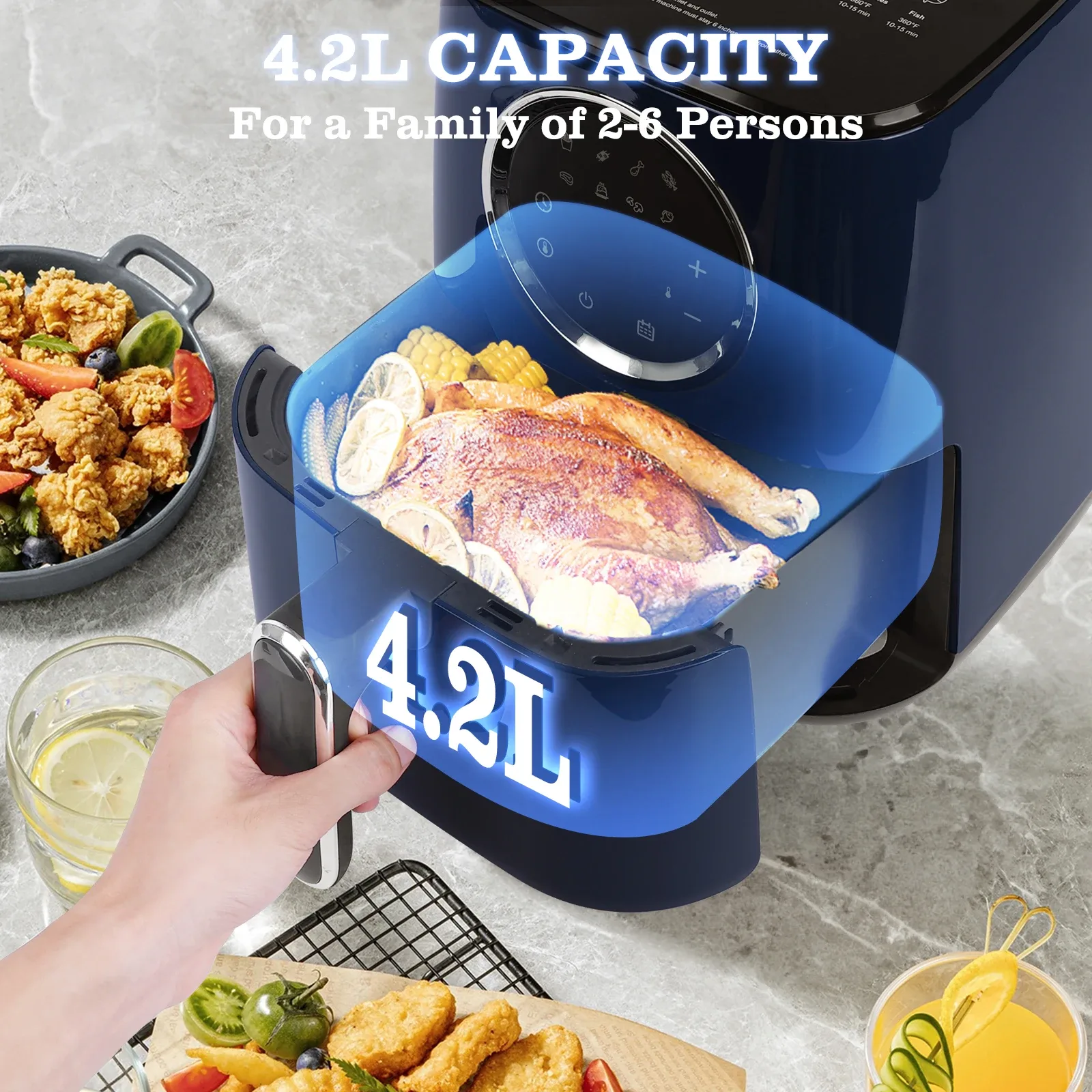 Le panier amovible de 4,2 litres est conçu pour accueillir les repas d’une famille de 4 à 6 personnes. Compacte mais généreuse, la Marina offre suffisamment d’espace pour préparer un poulet entier ou plusieurs portions de légumes, tout en s’intégrant facilement à votre cuisine.