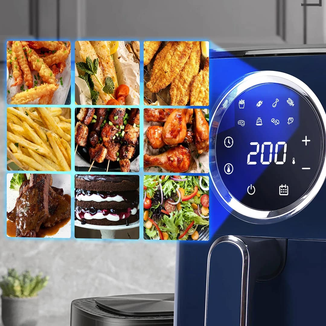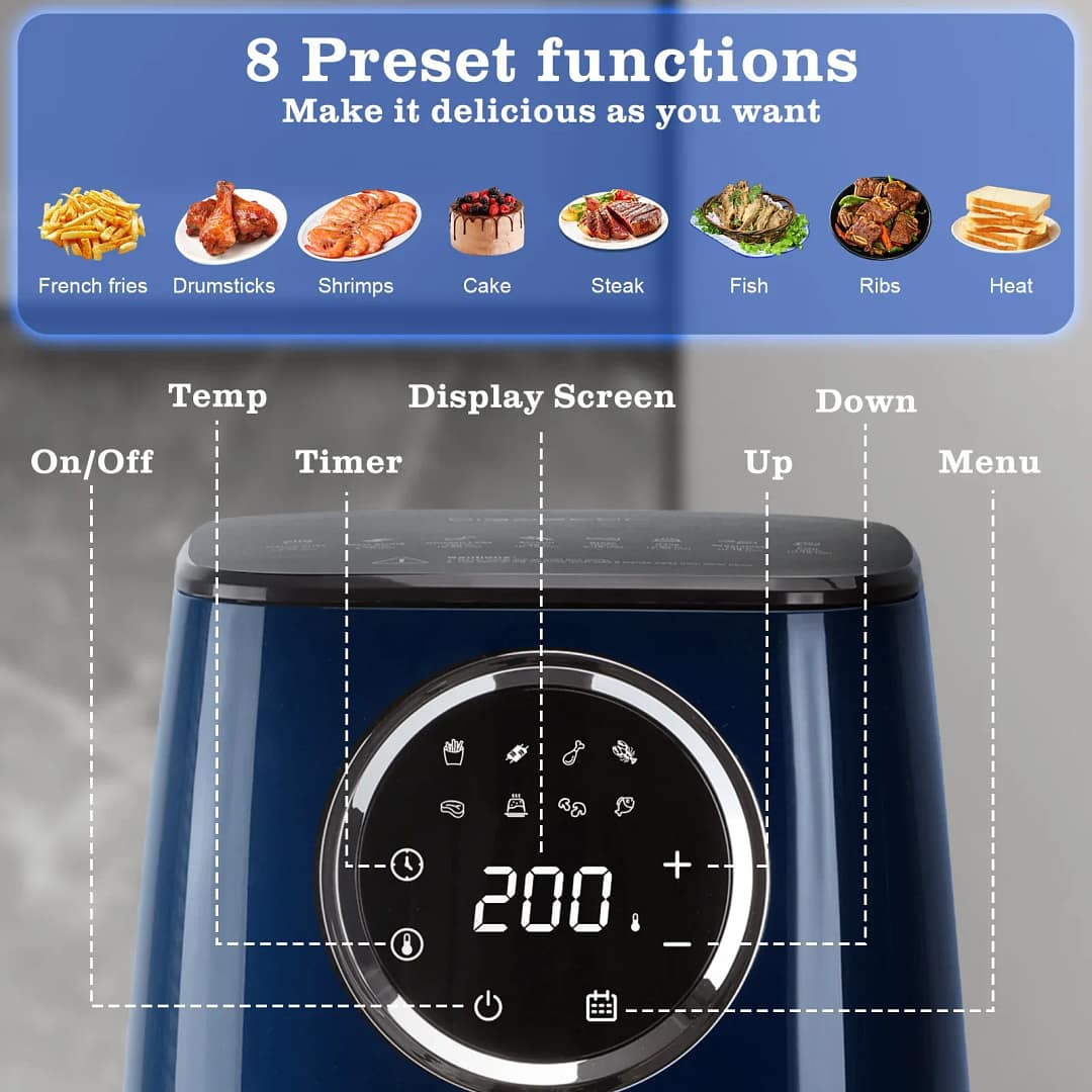 Avec son menu intelligent 8 en 1, cette friteuse à air propose des réglages automatiques pour cuire à la perfection vos frites, légumes, viandes, crevettes, gâteaux ou encore poissons. Chaque programme ajuste automatiquement la température (50 à 200°C) et la durée (jusqu’à 60 minutes) pour un résultat savoureux et homogène. Plus besoin de surveiller constamment vos plats : une simple pression suffit.