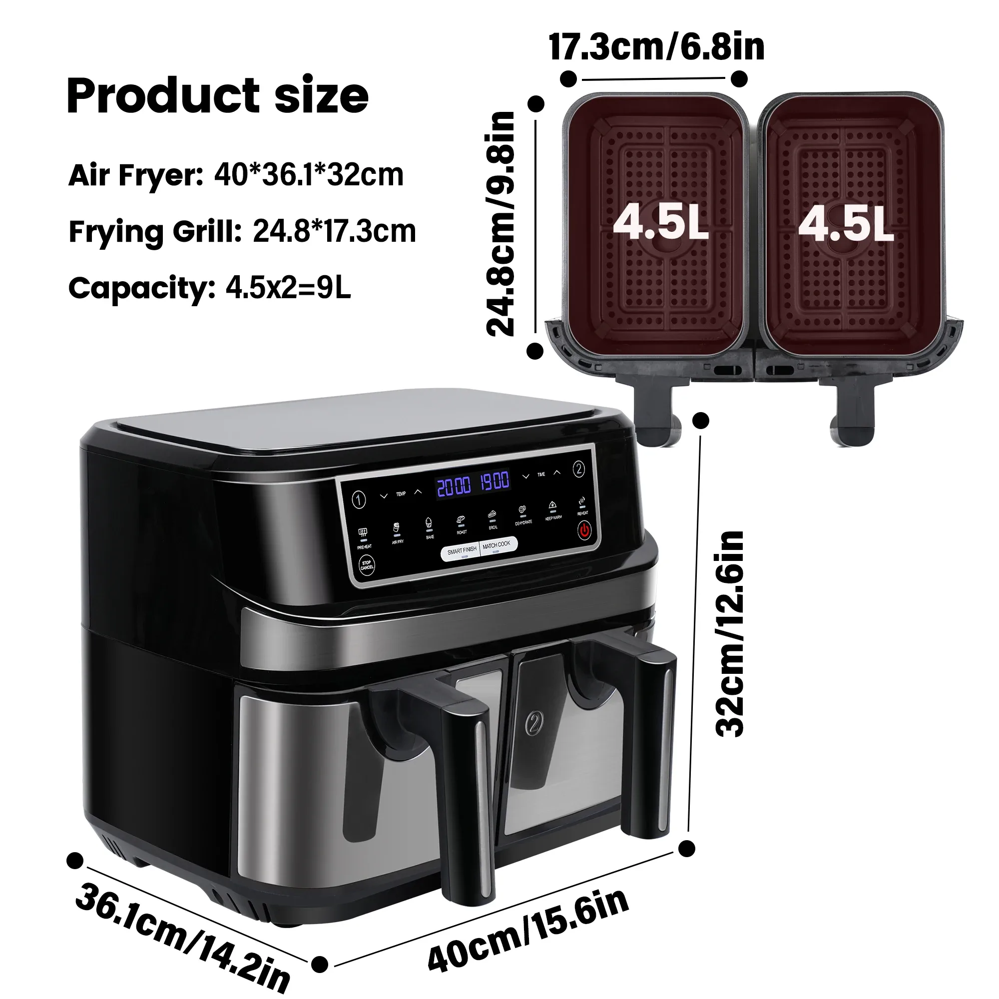 Friteuse à air chaud avec écran tactile LED, double chambre, 8 programmes automatiques, 2 bacs de 4,5 L
