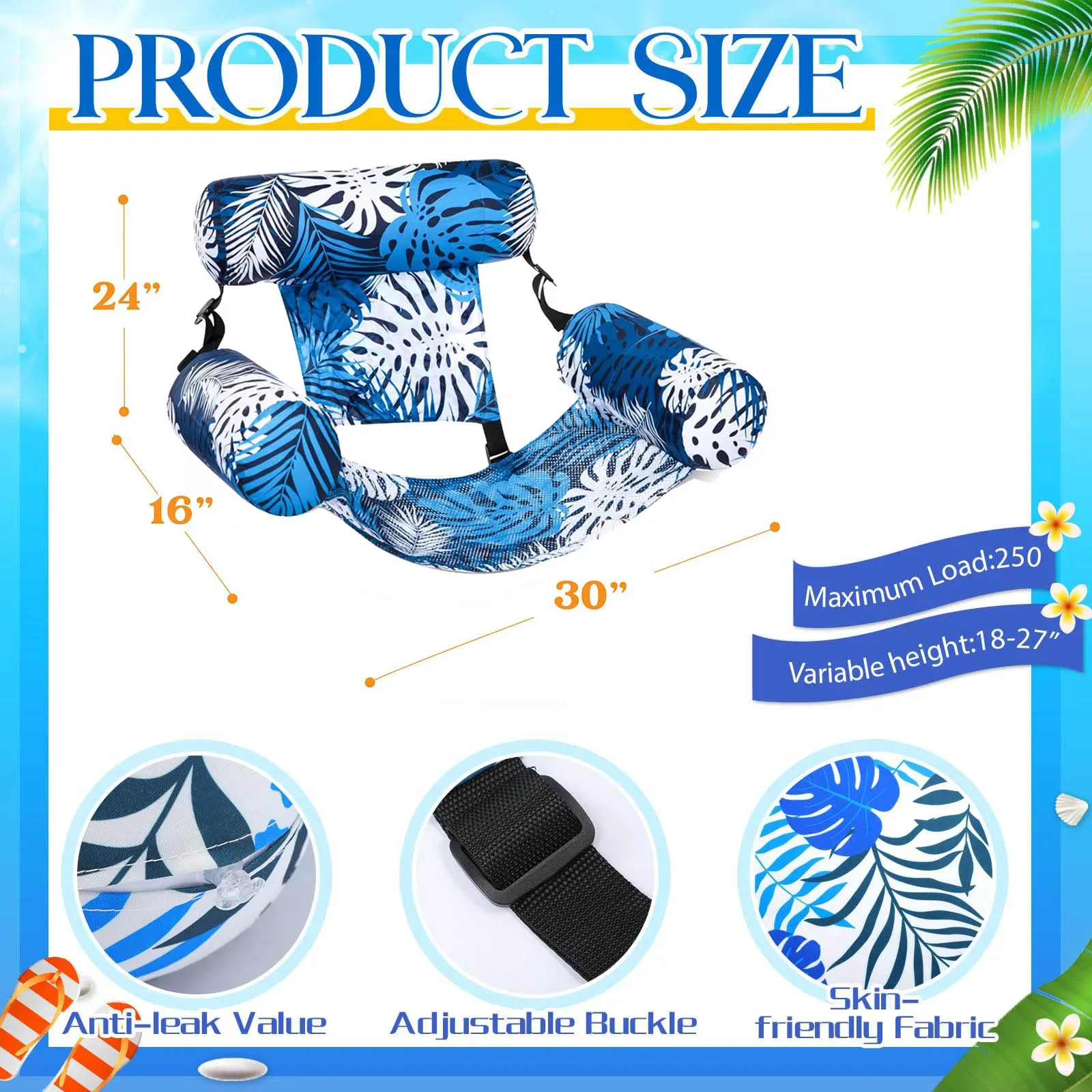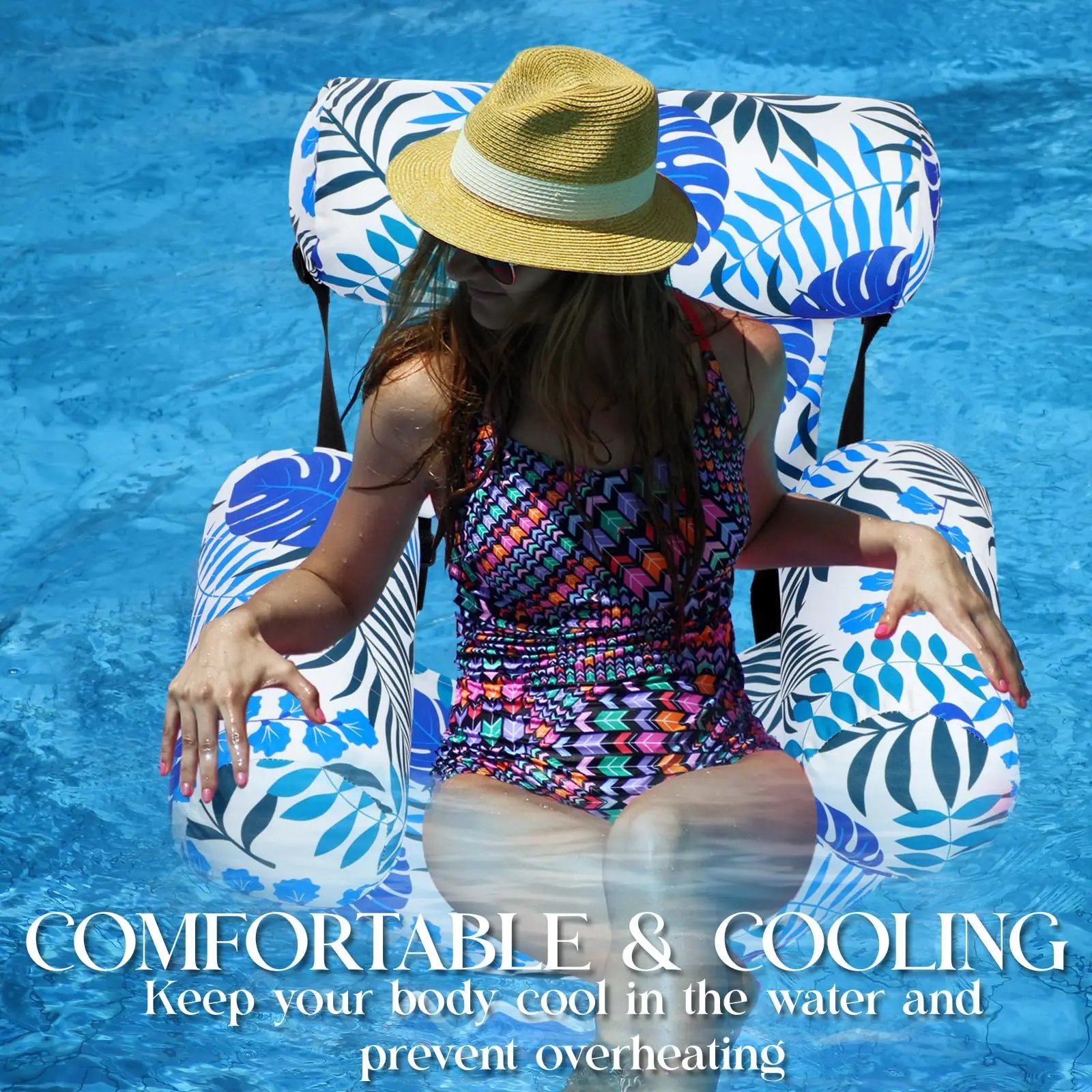 La chaise flottante adopte un look inspiré des feuilles exotiques qui rappelle les vacances sous les tropiques. Elle ne passe pas inaperçue : fraîche, tendance et instagrammable, elle sublime votre été tout en ajoutant une touche de fun et d’évasion à vos moments aquatiques.