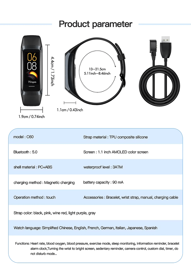 Ergonomie multilingue : l’interface de la montre connectée prend en charge plusieurs langues (français, anglais, allemand, espagnol, italien, russe, néerlandais, japonais, chinois, etc.), rendant la LIGE accessible à un large public. L’installation est simple : chargez la montre à 100 % puis scannez le QR du manuel pour télécharger l’app et jumeler l’appareil.