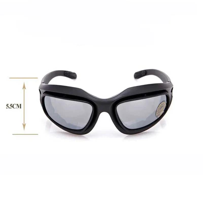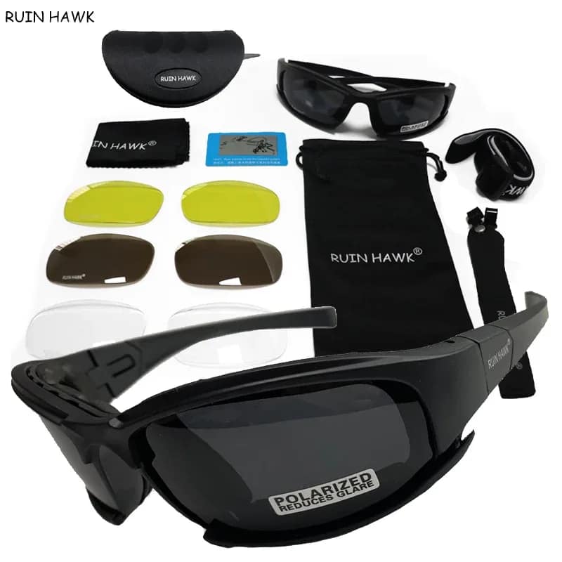 Lunettes tactiques X7/C5 avec 4 lentilles : polarisées, vision nocturne, anti-UV. Idéales pour chasse, airsoft, moto, tir et activités extérieures.