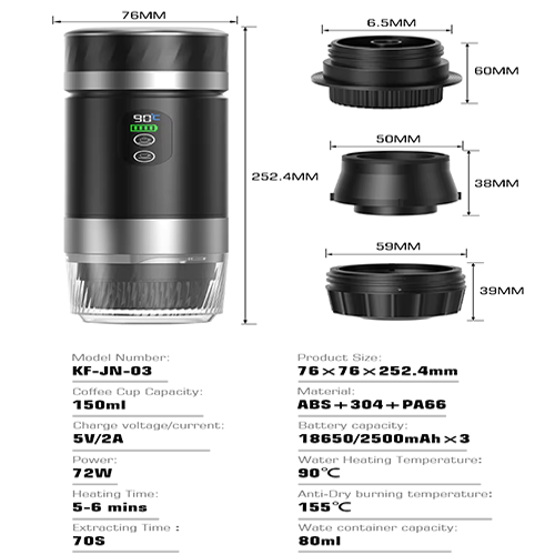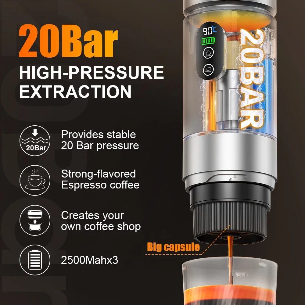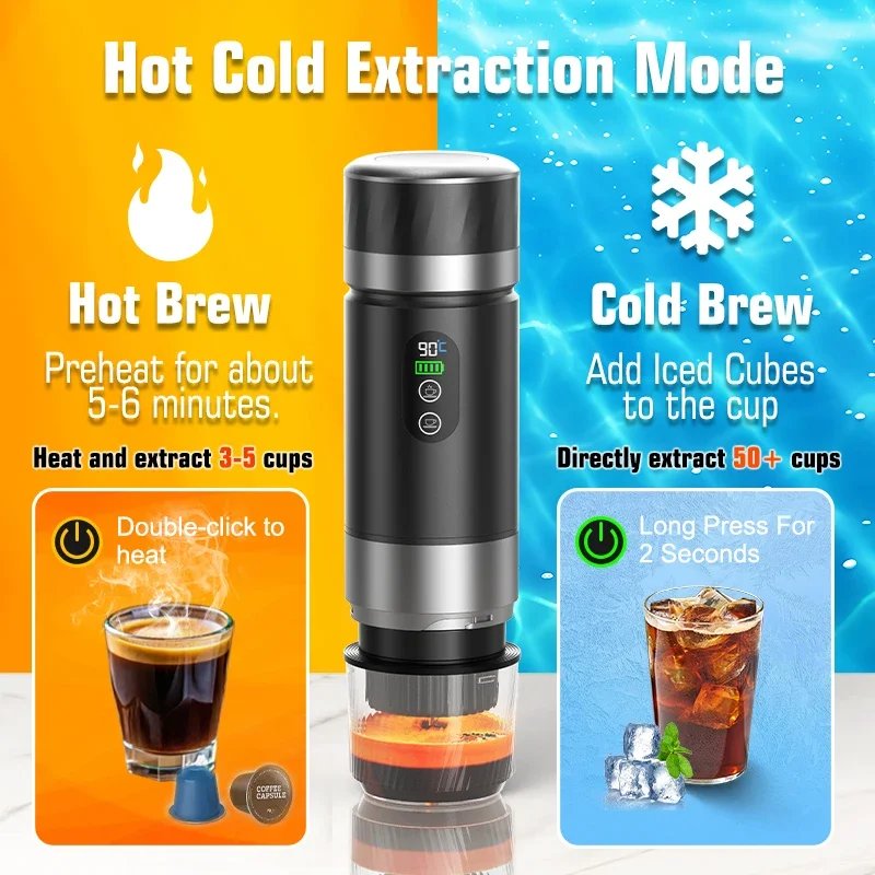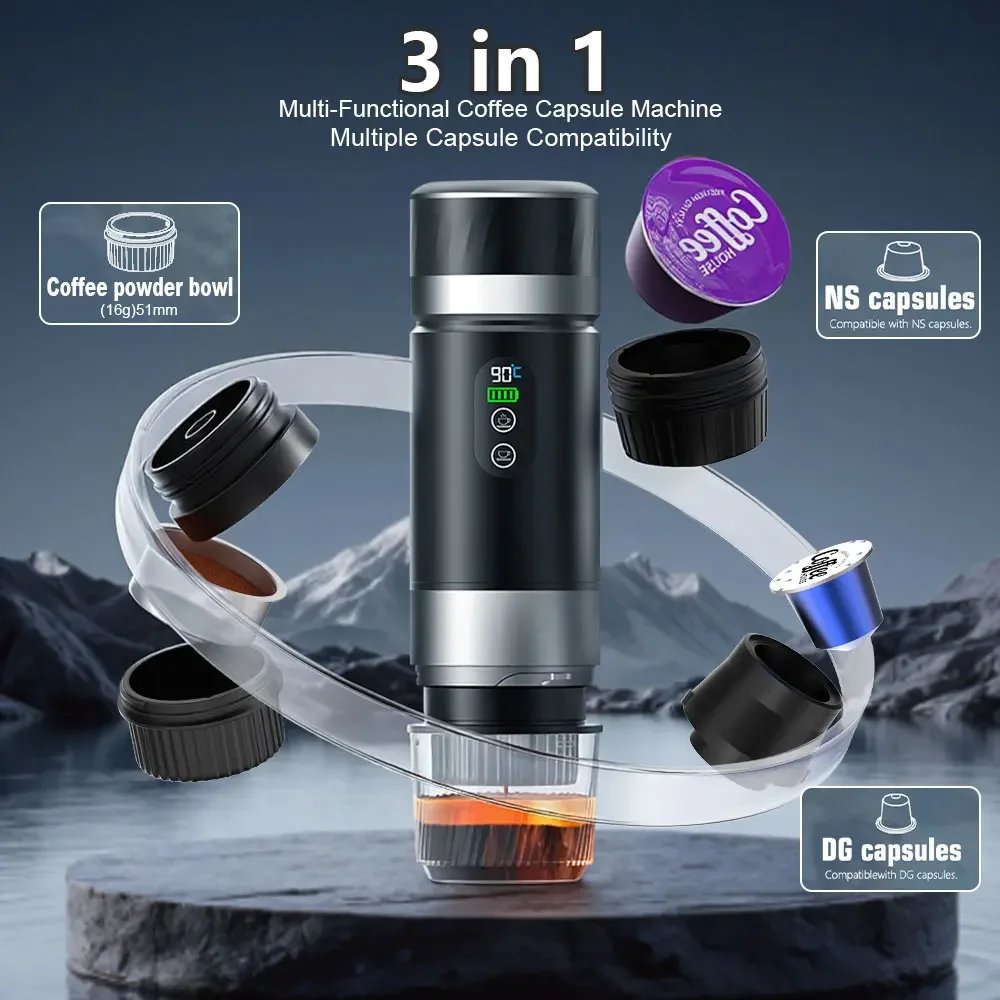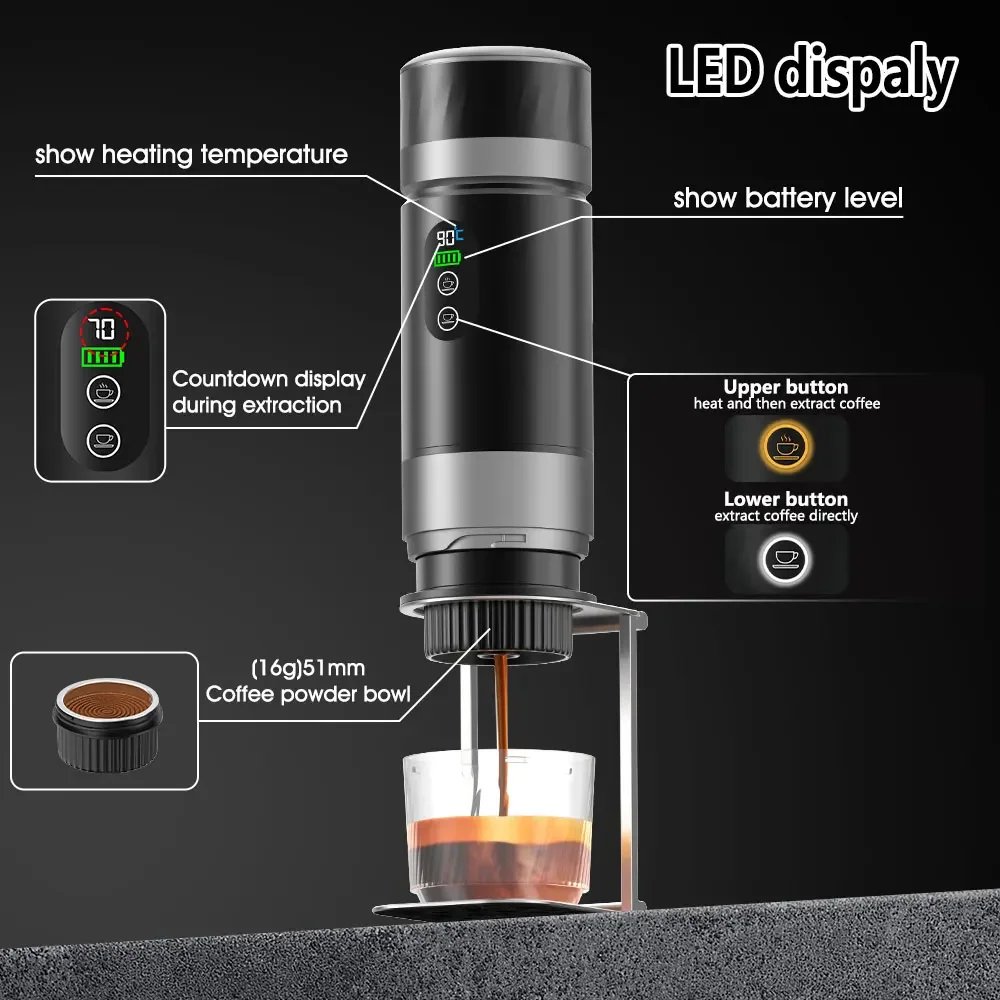 📝 Machine à café expresso portable DENOKIN 3 en 1 : 20bar, batterie amovible, chauffe-eau intégré, écran numérique. Parfaite pour voiture, maison et camping.