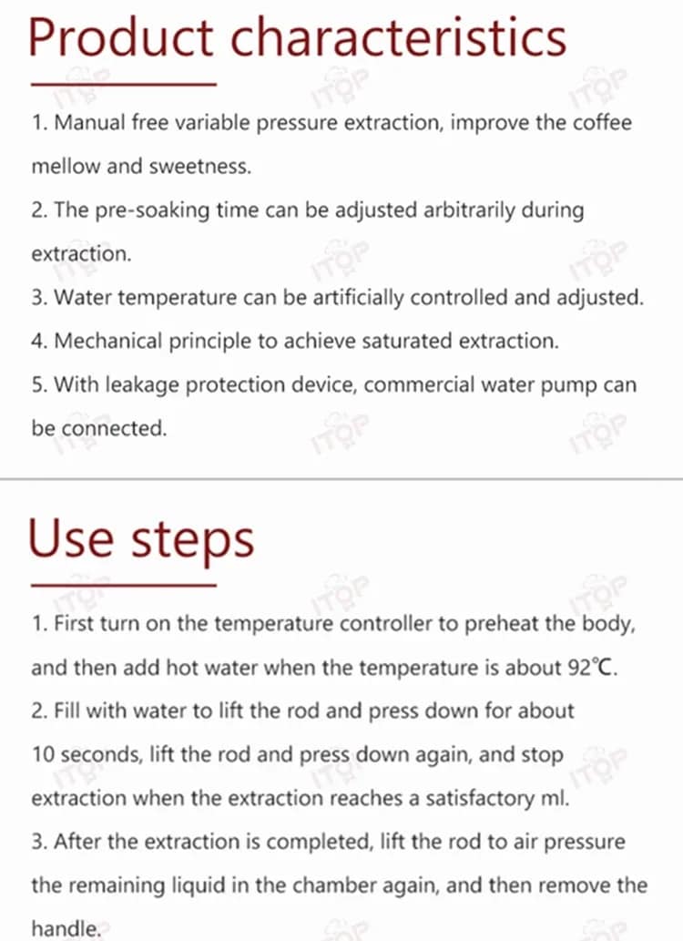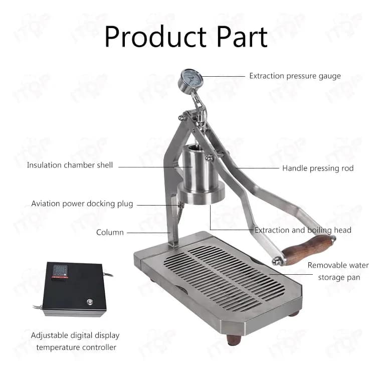 Amateurs de café et baristas exigeants, découvrez la Main Presse Machine Expresso IT-HPEM-3, une machine à levier manuel haut de gamme conçue pour extraire l’expresso parfait, avec un contrôle total de la température et de la pression. Alliant design robuste, affichage en temps réel et une expérience d’extraction digne d’une machine professionnelle, ce modèle est idéal pour les passionnés cherchant une qualité supérieure à domicile.