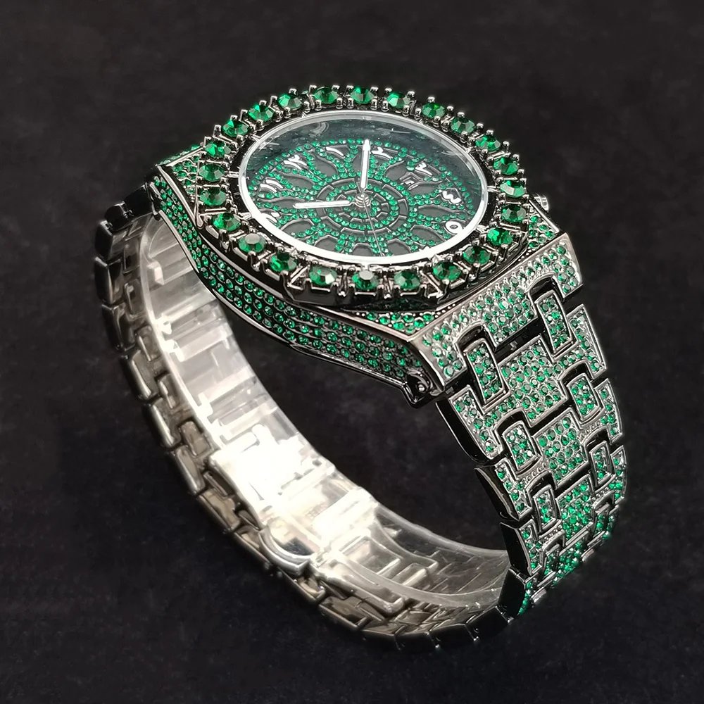 Le cadran rond WEISIKAI attire immédiatement le regard grâce à son design serti de pierres vertes décoratives qui apportent une touche originale et élégante. Associé à un bracelet en acier inoxydable, l’ensemble offre une apparence luxueuse et moderne.